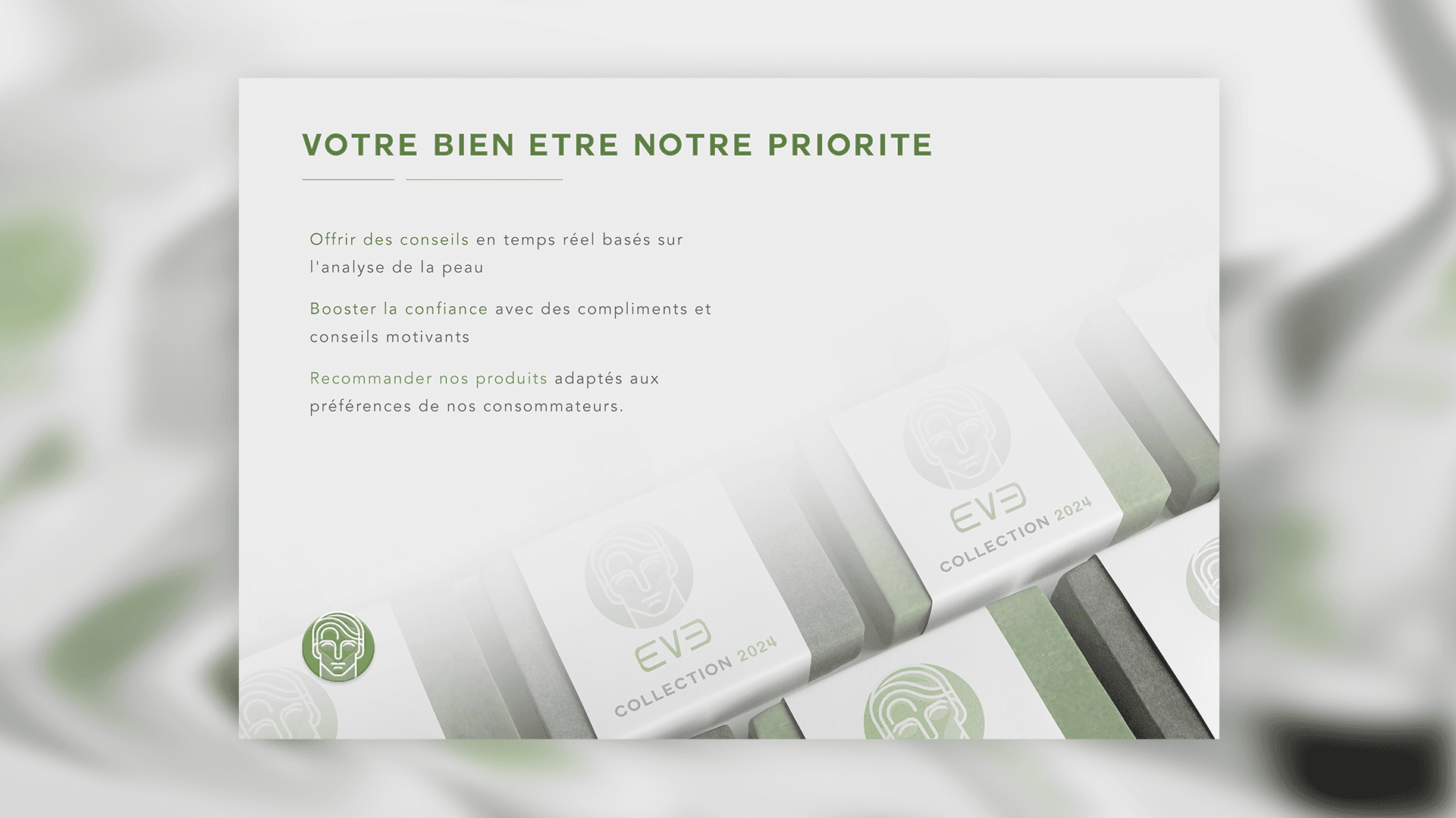 EVE explore les paradoxes de l’industrie cosmétique. La quête de perfection extérieure peut dissimuler des impacts négatifs sur l’estime de soi. Grâce à un storytelling visuel et une interface immersive, ce projet invite à une prise de conscience sur les standards de beauté et les effets du consumérisme technologique.