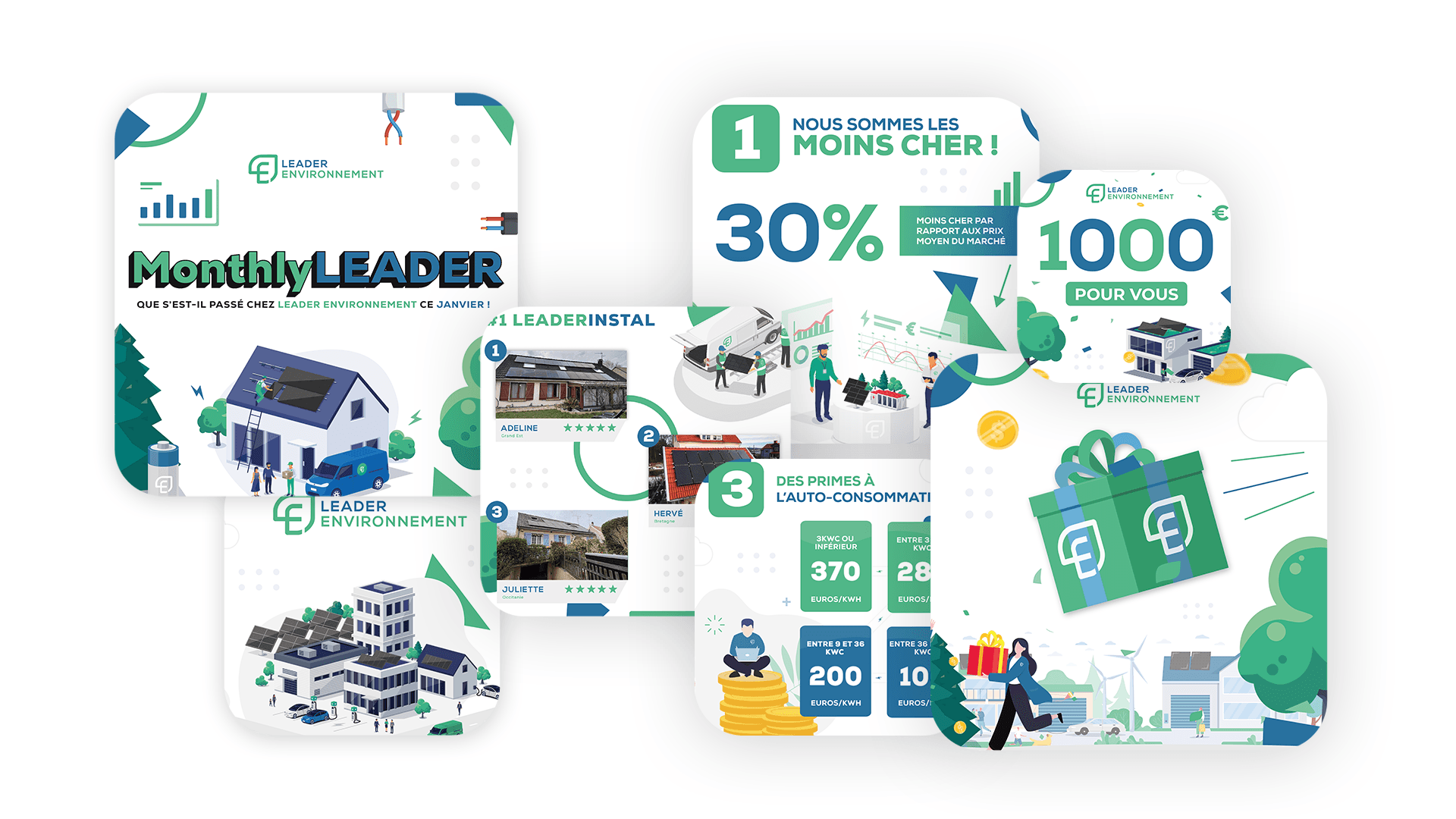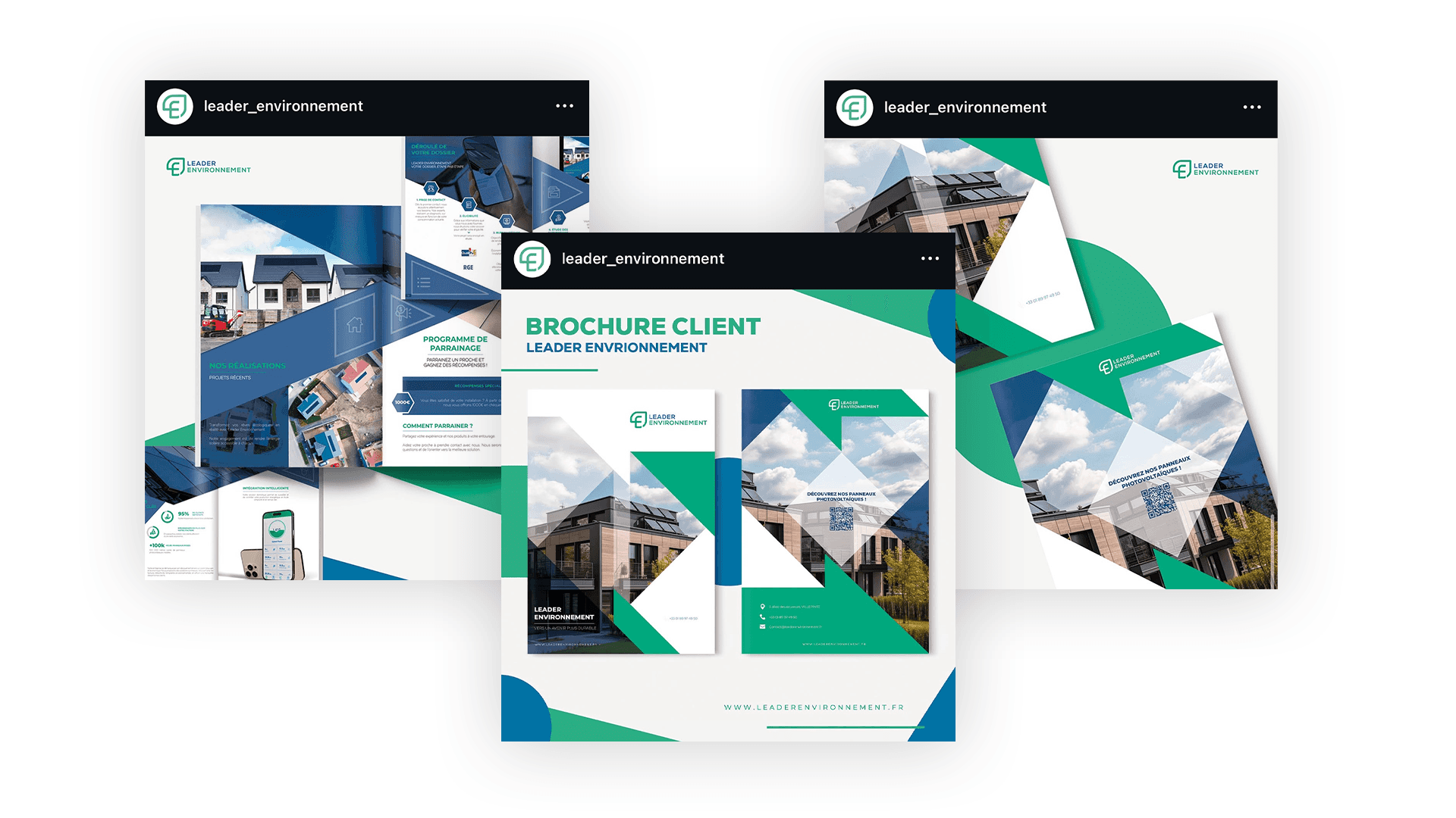 Travaillant seul au sein du service marketing, j’ai pris en main la création et la gestion de l’identité visuelle de Leader Environnement, qui était inexistante avant mon arrivée. J’ai ainsi pu développer une image cohérente sur tous les supports : logos, vidéos, réseaux sociaux, supports imprimés et outils digitaux.