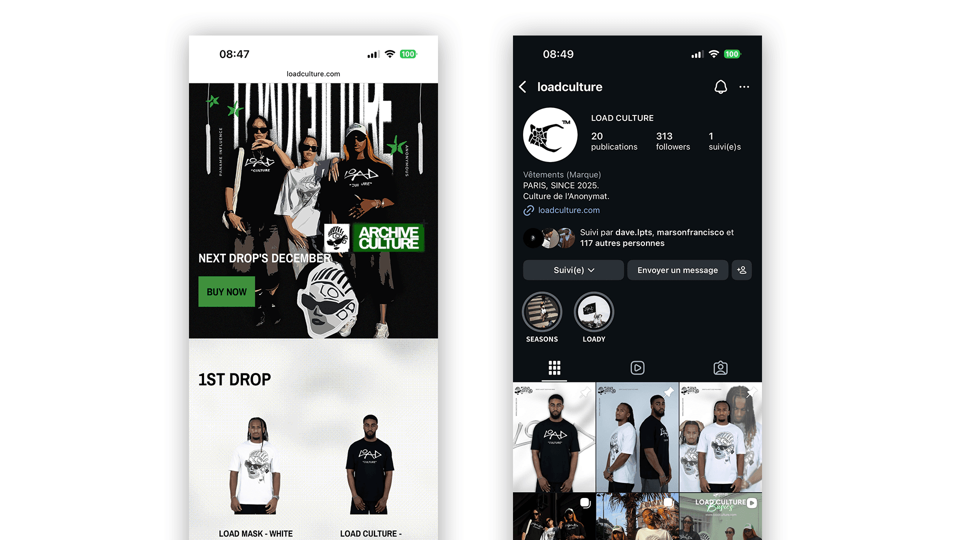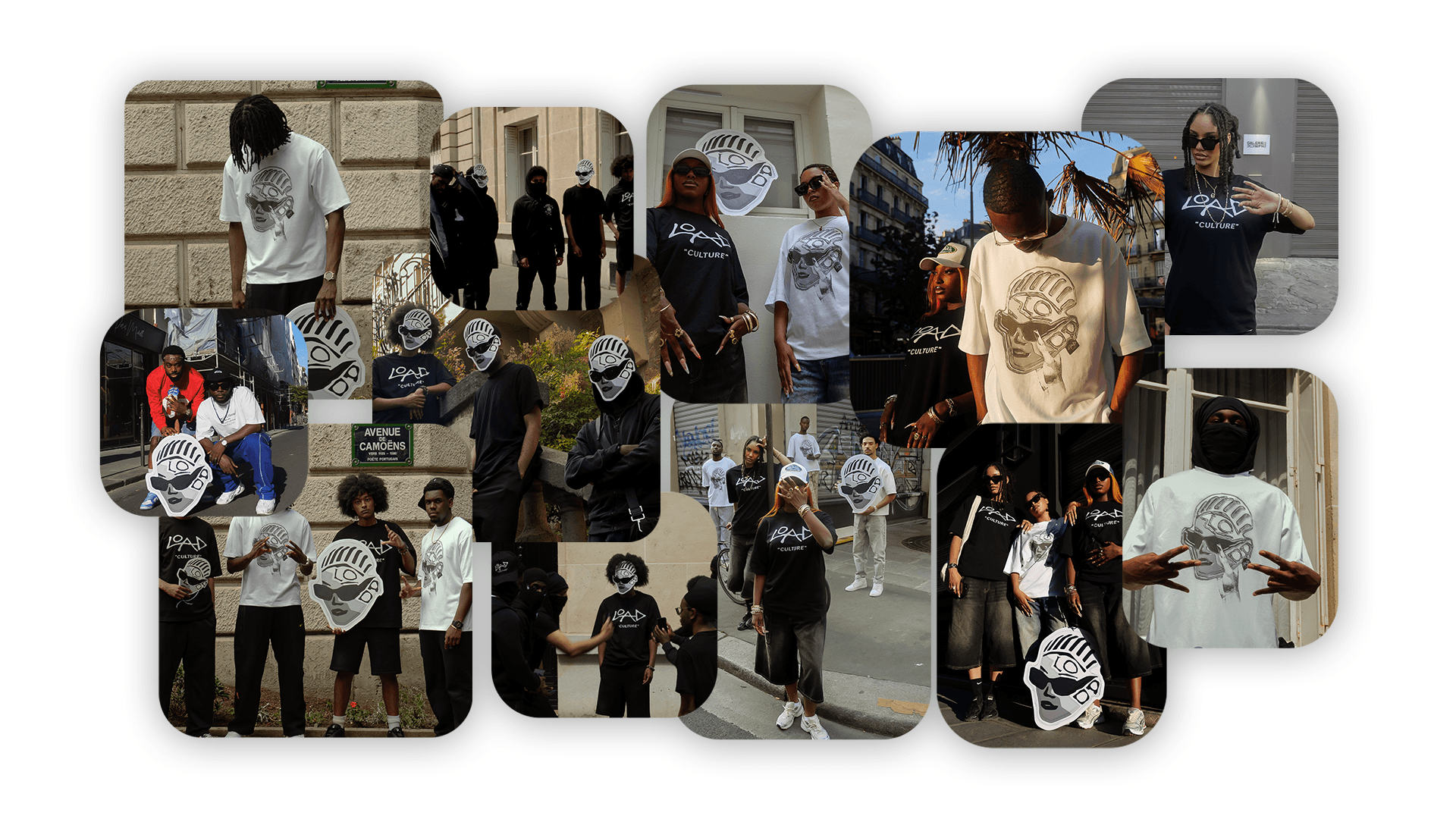 L’identité visuelle de LOAD CULTURE repose sur l’énergie brute de la rue. Le logo-masque incarne l’anonymat comme force politique et créative, tandis que la signature typographique évoque le graffiti et l’écriture spontanée. Plus qu’une marque de vêtements, LOAD se définit comme un mouvement : chaque pièce est pensée comme un marqueur culturel, rare et porteur de sens, nous avons le désir de promouvoir la culture artistique de paris, par la musique, le sport, l'art…